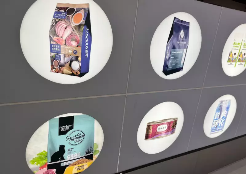 豐尚智慧園展廳牆面展示旗下覆蓋的飼料終端客戶產品,包括寵物糧、水產飼料等多個品類。巴士的報記者攝