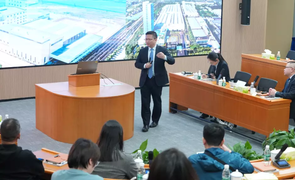 邁安德全球營銷副總裁李旭東向香港媒體參訪團作簡報,背景大屏顯示公司廠區鳥瞰。巴士的報記者攝