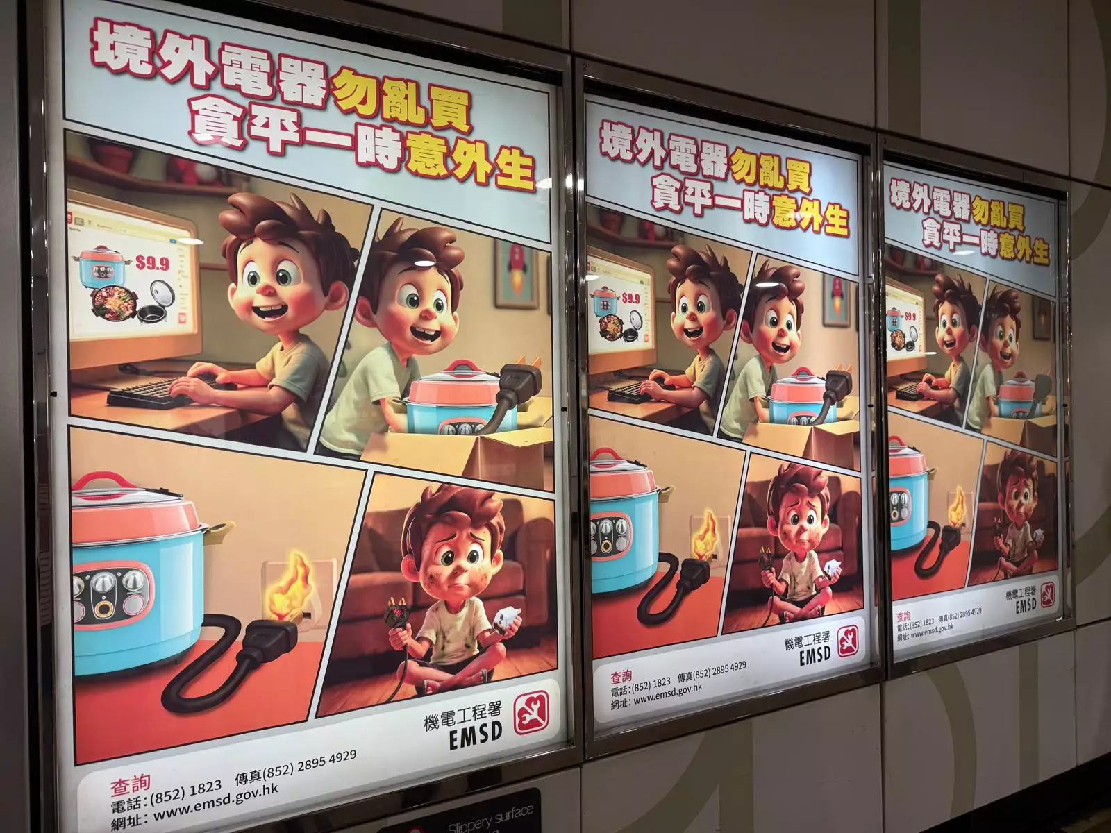 大火過後,不少市民自覺提升安全意識,政府也高度重視用電及消防安全的宣傳。近日,大家經過地鐵站時,不難發現機電工程署張貼的大字海報,警示市民切勿因「貪平」而亂買「境外電器」,避免發生意外。這類宣傳海報傳遞的訊息十分清晰,就是購買[境外電器] 產品就必然伴隨「安全隱患」。