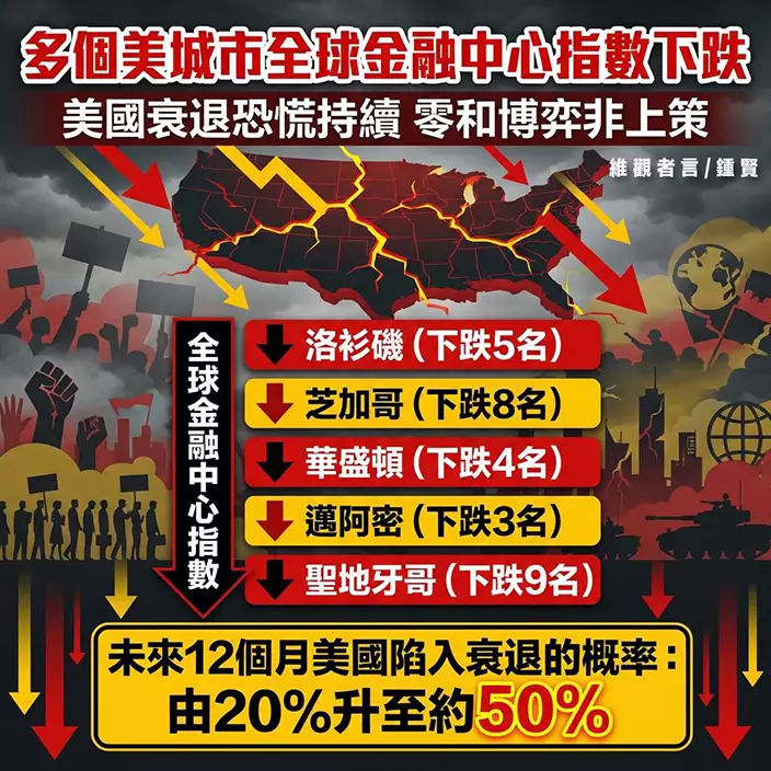 美國在中東發動戰爭,油價失控,失業上升,將美國推至經濟滑落的邊緣,而多間金融機構已把美國經濟未來12個月陷入衰退的概率上調;中國《國際信息研究所》引用華爾街數據分析指,美國一般在1年內陷入衰退的基率為 20%,但穆迪分析推算有關機率已升至 48.6%,高盛預測機率上調至30%,而 Wilmington Trust亦預測概率約為45%。在市場不穩情緒持續下,美國各地哪有能力保持金融中心的地位?