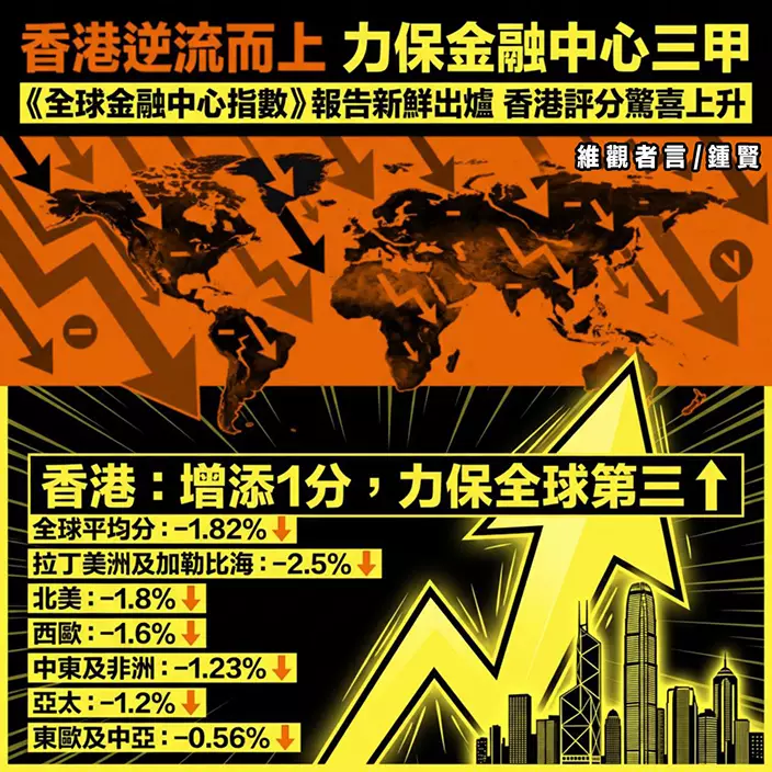 英國Z/Yen集團與中國(深圳)綜合開發研究院聯合發布第39期《全球金融中心指數》報告新鮮出爐,多個歐美國家疑受國際政局不穩拖累,排名大跌,香港力保全球第三的排名,而總評分更比往年上升1分,緊隨紐約及倫敦的步伐,繼續蟬聯亞洲第一金融中心的美譽。
