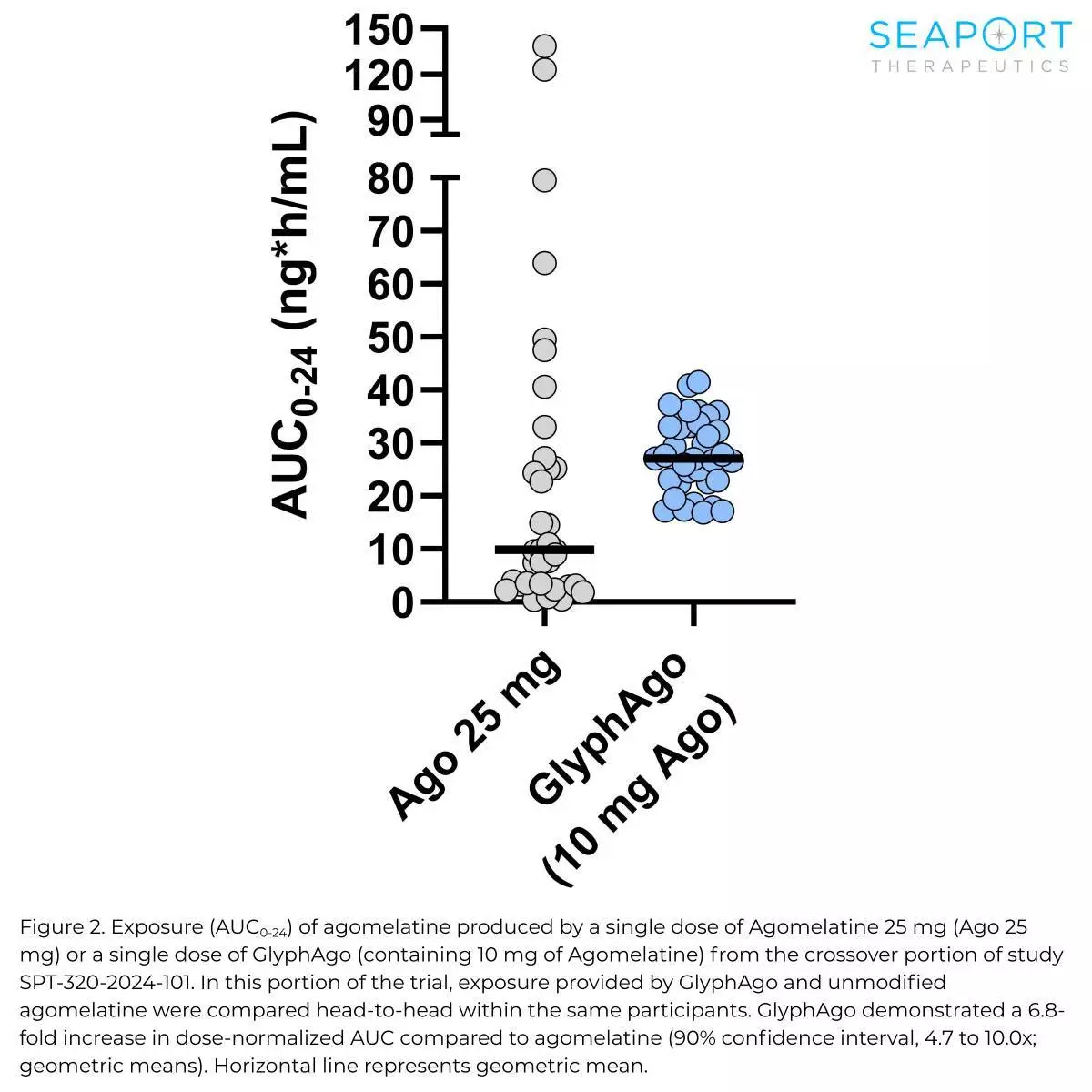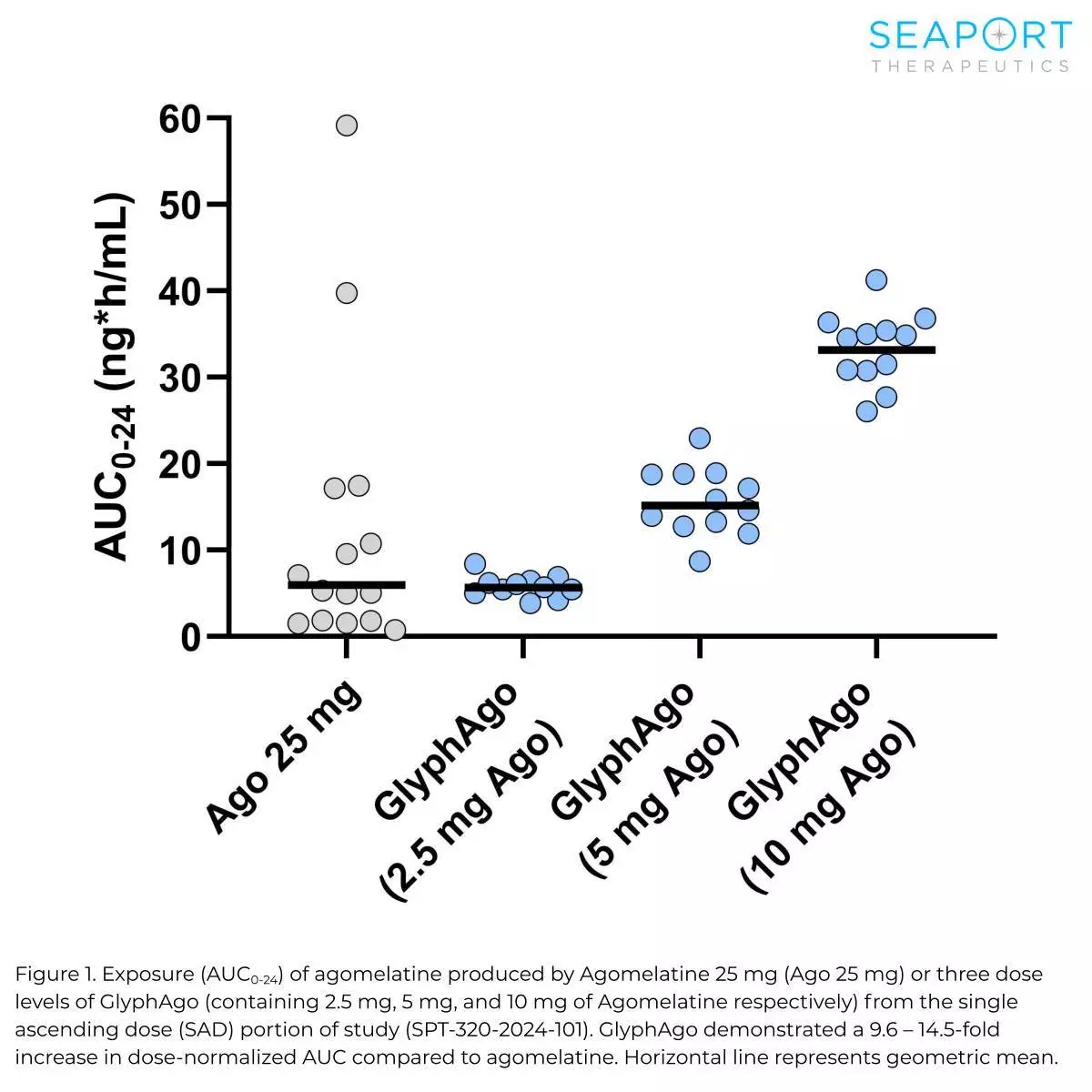 在試驗的頭對頭交叉部分,GlyphAgo的阿戈美拉汀生物利用度較未經修飾的口服阿戈美拉汀增加6.8倍。GlyphAgo的藥代動力學變異性亦顯著降低(10倍),優於未經修飾的阿戈美拉汀。交叉試驗部分包括服用含雌激素口服避孕藥(estrogen-containing oral contraceptives)的參與者,已知這些藥物會因肝臟藥物相互作用而增加阿戈美拉汀的暴露。相反,GlyphAgo的暴露不受口服避孕藥影響,進一步支持GlyphAgo能繞過肝臟首關代謝。在試驗的另一單次遞增劑量部分,GlyphAgo的劑量標準化暴露較阿戈美拉汀增加9.6至14.5倍,該部分參與者並無服用口服避孕藥。GlyphAgo耐受性良好,未觀察到任何肝臟相關不良事件。已完成的單次遞增劑量及交叉試驗部分共涉及約130名參與者,達成了試驗的藥代動力學概念驗證目標。目前進行中的多次遞增劑量部分(僅使用GlyphAgo)旨在進一步闡明GlyphAgo重複給藥的安全性及藥代動力學。