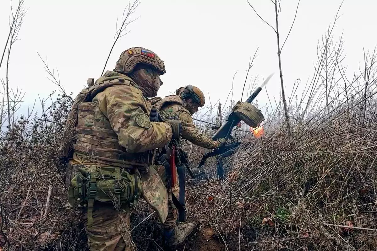 俄羅斯國防部新聞處於2026年3月31日周二提供的影片截圖顯示,俄羅斯士兵在烏克蘭一個未公開地點,向烏克蘭陣地發射榴彈發射器。(美聯社圖片/俄羅斯國防部新聞處) AP圖片