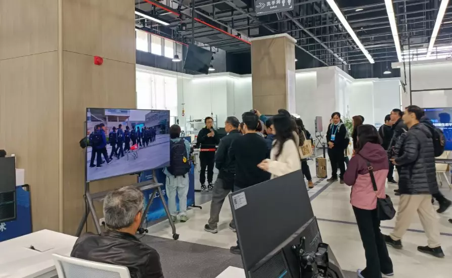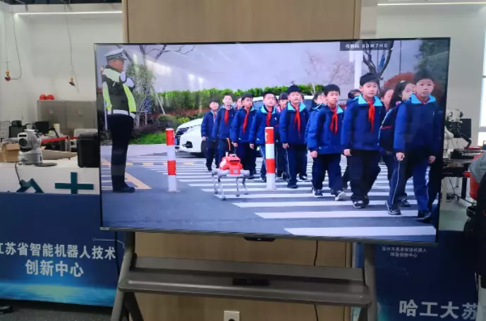 哈爾濱工業大學蘇州研究院展台大屏播放機械導盲犬「小蘇」引領學生過馬路的演示片段,展示其自主導航能力。巴士的報記者攝