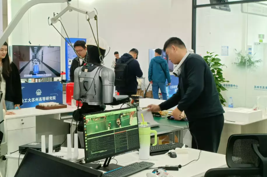 中心場內展示多款機械人產品。哈爾濱工業大學蘇州研究院自主研發的導盲犬機械人「小蘇」,具備自主導航及障礙規避能力,今年上半年將正式入駐蘇州市盲聾學校。工作人員指,全國視障人群逾千萬,而現役導盲犬僅約百隻,研發機械導盲犬正是回應此需求。