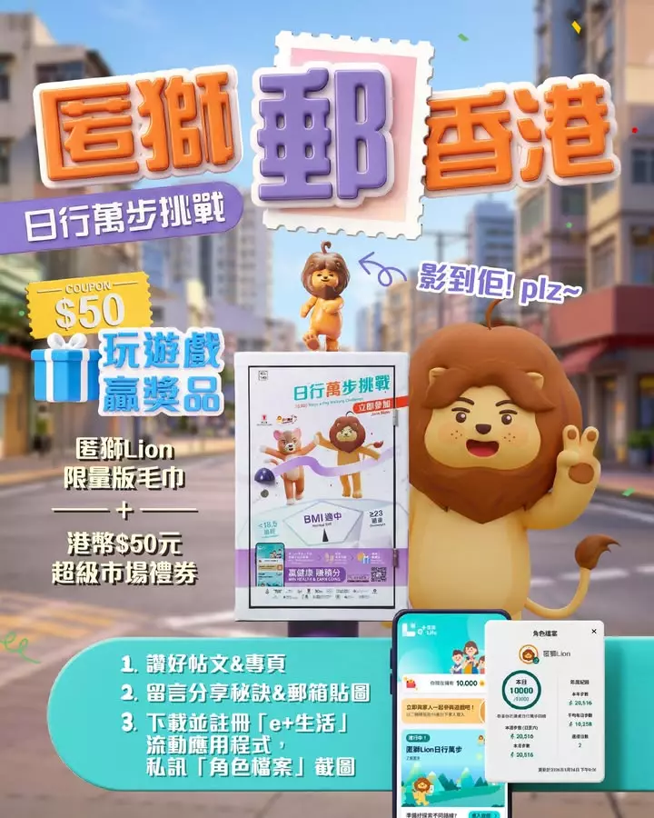衞生署衞生防護中心的健康推廣吉祥物「匿獅Lion」,最近在港九新界10個郵筒上現身,化身成有型的3D立體雕塑,邀請市民參與「日行萬步」挑戰,邊打卡邊賺健康積分。