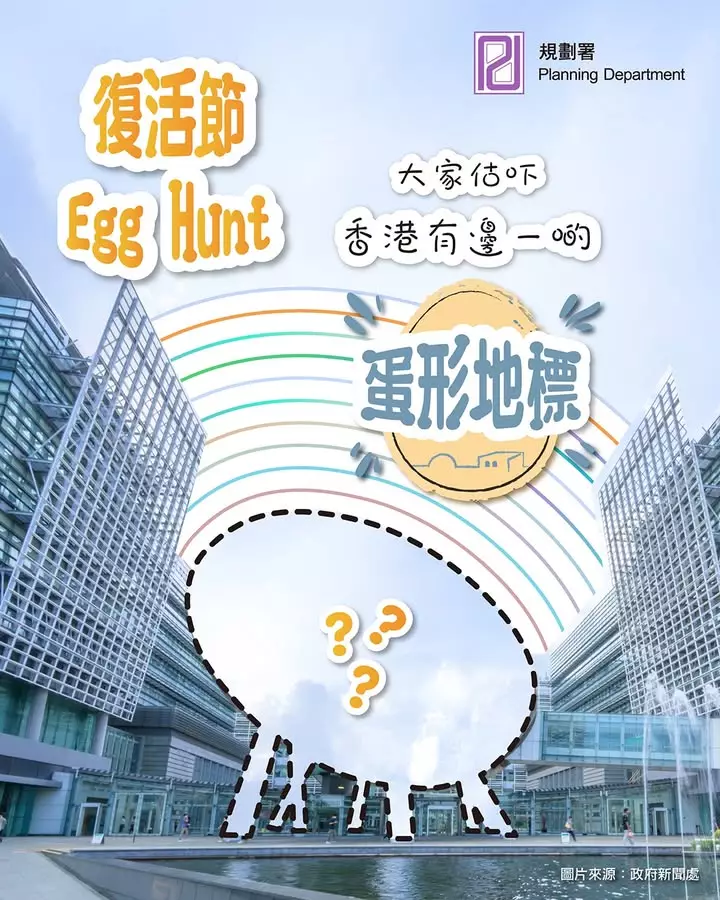 復活節將至,規劃署在社交平台發起「復活節 Egg Hunt - 無獎競猜」活動,搜羅多張「蛋型地標」美照,邀請市民尋找城市中的「彩蛋」。