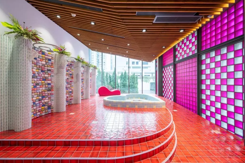 是次展覽設計極具心思,為參觀者營造出充滿儀式感的觀展流程。展廳下層掛滿浴袍,完美模仿服務櫃台的入口環境;當步上二樓,參觀者需換上拖鞋方可進入「浴場」展區。最吸睛的展品莫過於由超過1,1200塊手工陶瓷磚組成的心型浴池——《左旋們(心)》,展示出不同形狀的陶瓷番梘。