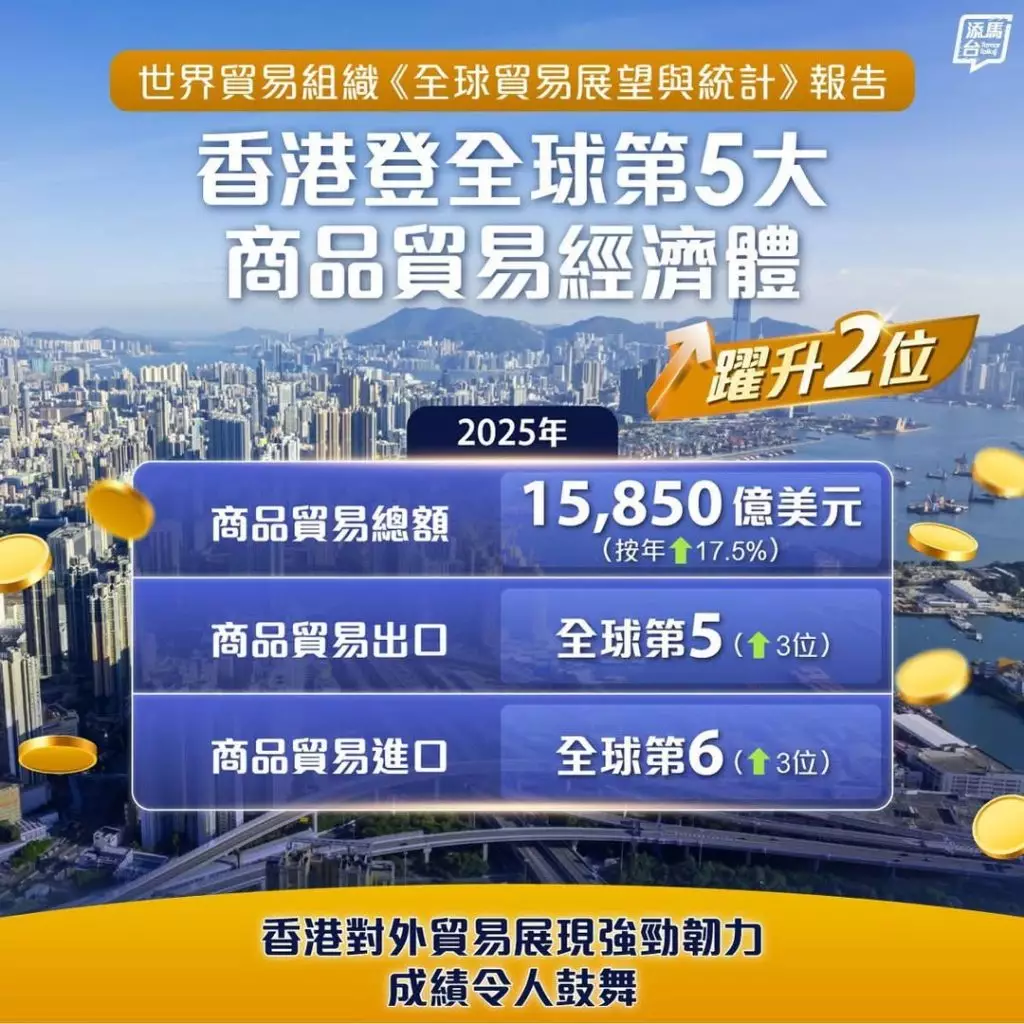 財政司副司長黃偉綸引述世界貿易組織最新發表的《全球貿易展望與統計》報告指出,香港去年商品貿易總額達15850億美元,按年上升17.5%,佔全球總額3%,並緊隨中國內地、美國、德國與荷蘭,躍升為全球第五大商品貿易經濟體。他形容此成績令人振奮。