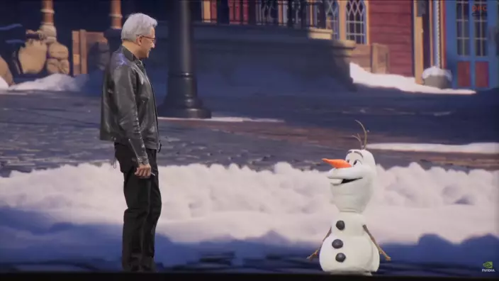 黃仁勳與雪寶機械人跨次元互動 。影片截圖