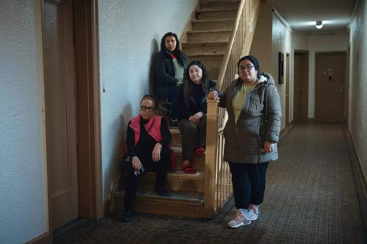 2026年3月17日周二,紐約布朗克斯(Bronx)一幢租客投訴維修問題及蟲害的大廈內,33歲的古爾哈約·尤爾多舍娃(Gulhayo Yuldosheva,中右)與65歲的瑪麗娜·奎羅茲(Marina Quiroz,上)及另外兩名居民合照。(美聯社圖片/Andres Kudacki) AP圖片