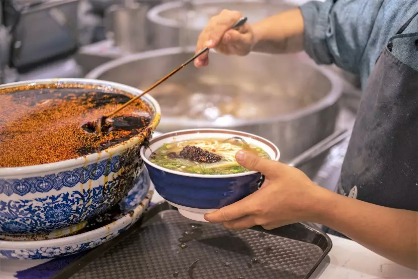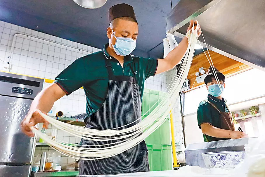 在街頭的麵館裡,拉麵師傅站在明檔案板前,手腕翻飛、麵條如練。這門手藝靠的是肌肉記憶與常年累積的力道控制,也是蘭州牛肉麵得以走出西北、走向全國的技術基石。