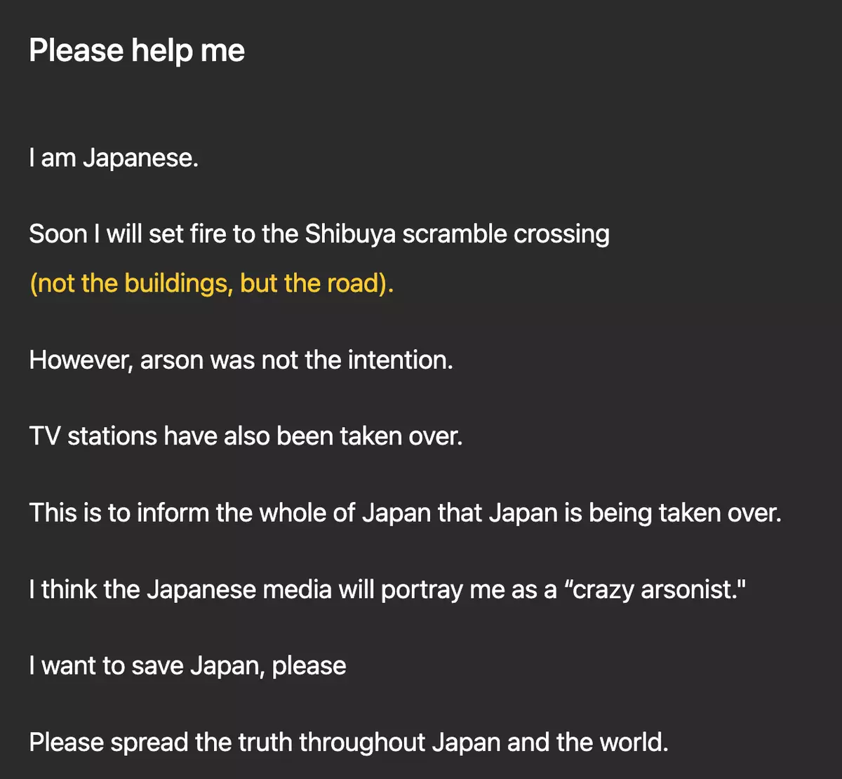 記者到紙牌上寫着的網站了解,發現有人在網站上就事件道歉,並以英語寫下「放火預告」,稱自已很快會在燒澀谷十字路口放火,但縱火並非其本意,這樣做是為了讓全日本知道,日本正在被控制。發文者認為日本媒體會把自已描繪成一個「瘋狂的縱火犯」,稱自己想拯救日本。