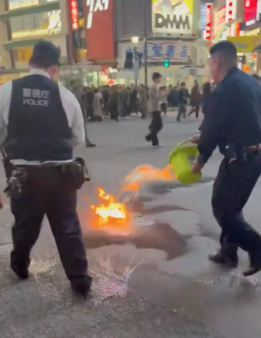 該男子縱火後走入人群中消失。未幾,有穿着寫着「警視廳」背心的警察和另一名男子,拿着小水筒以滅火筒將火救熄。消防及增援警務人員及後到場,封鎖現場調查善後。