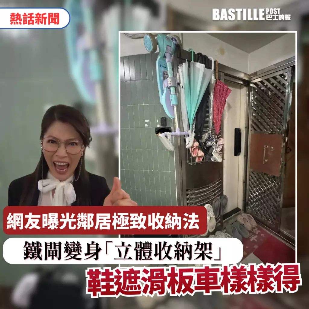 香港寸土寸金人盡皆知,為了絞盡心思利用好每一處空間,港人可謂是大顯神通。日前就有網民在Threads上載一張鄰居家老式防盜門照片,只見鐵門上及周邊空間被用到了極致,不僅僅掛滿雨傘、鞋子,甚至連小朋友的滑板車都可掛上門!