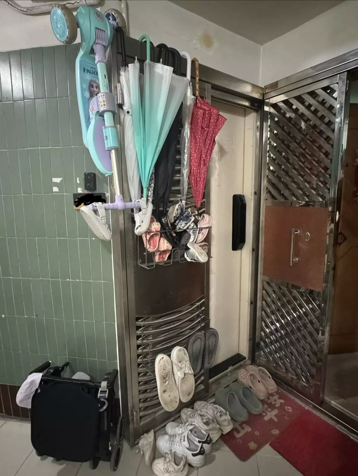 據照片所見,屋主秉承用到盡的理念,成功將防盜門變身「立體收納架」,該防盜門的上層掛有7把雨傘,包括透明傘、黑傘、紅底波點傘等,中層同下層都塞滿多對鞋子,而最令人眼前一亮的是,一架兒童滑板車亦成功「上門」,車的把手甚至還掛上一對小白鞋,絕對是收納收到盡。