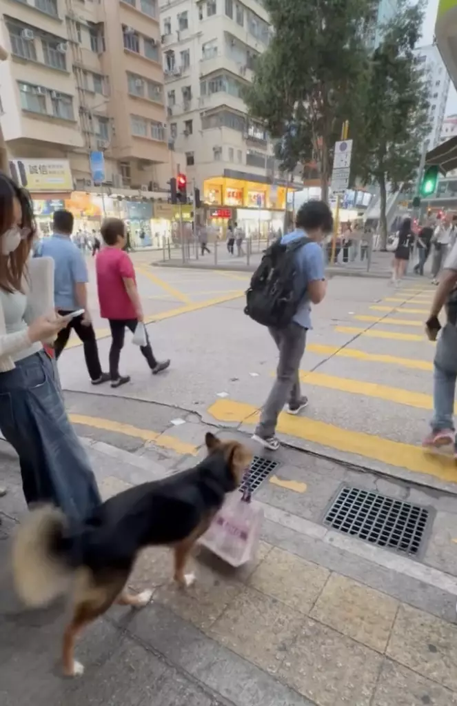 影片所見,該隻狗狗在行人路上等待過馬路,面前放著一個手挽袋。綠燈亮起後,身穿淺藍色上衣的男主人回頭呼喚,狗狗隨即叼起袋子緊隨其後。