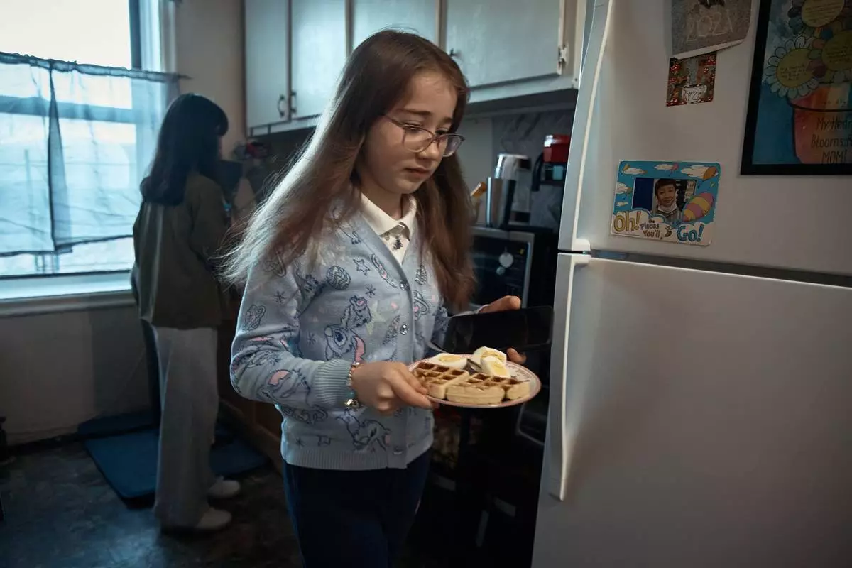 周二(2026年3月17日),古爾哈約·尤爾多舍娃(Gulhayo Yuldosheva)的女兒們在紐約市布朗克斯區一棟公寓大廈吃早餐,該處租客反映維修問題及蟲害。 (美聯社圖片/安德烈斯·庫達奇) AP圖片