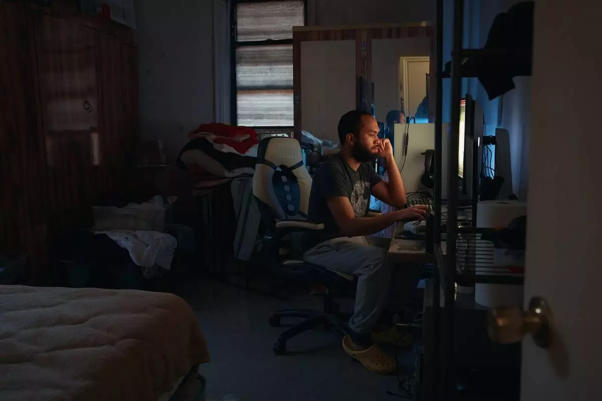 周二(2026年3月17日),瑪麗娜·奎羅斯(Marina Quiroz)的兒子在紐約市布朗克斯區一棟公寓大廈使用電腦,該處租客反映維修問題及蟲害。 (美聯社圖片/安德烈斯·庫達奇) AP圖片
