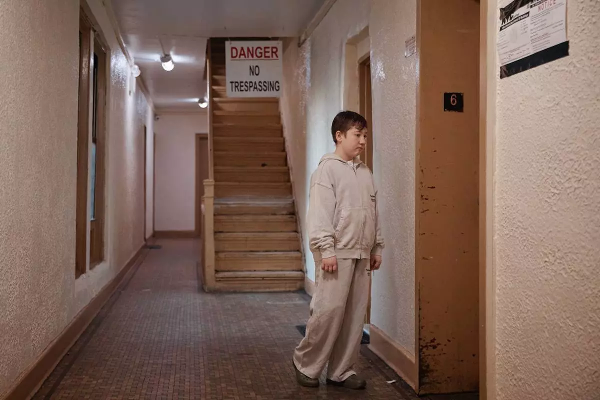 周二(2026年3月17日),11歲的古爾哈約·尤爾多舍娃(Gulhayo Yuldosheva)的兒子赫里貝托(Heriberto)站在紐約市布朗克斯區一棟公寓大廈內,該處租客反映維修問題及蟲害。 (美聯社圖片/安德烈斯·庫達奇) AP圖片