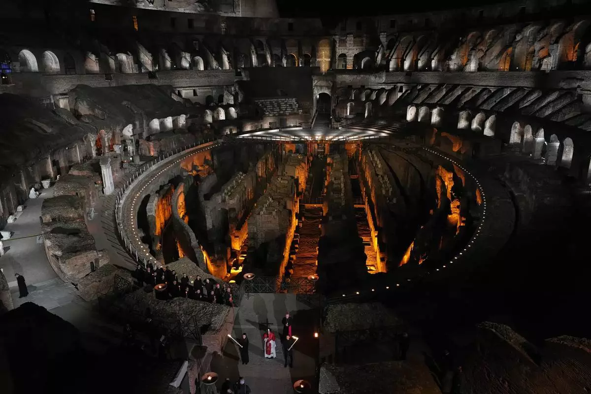 信眾於2026年4月3日周五,在羅馬鬥獸場參與由教宗利奧十四世帶領的苦路(Via Crucis)燭光耶穌受難日(Good Friday)遊行,象徵性地重現耶穌基督在耶路撒冷各各他(Calvary)被釘十字架的歷程。(美聯社圖片/格雷戈里奧·博爾吉亞 Gregorio Borgia) AP圖片