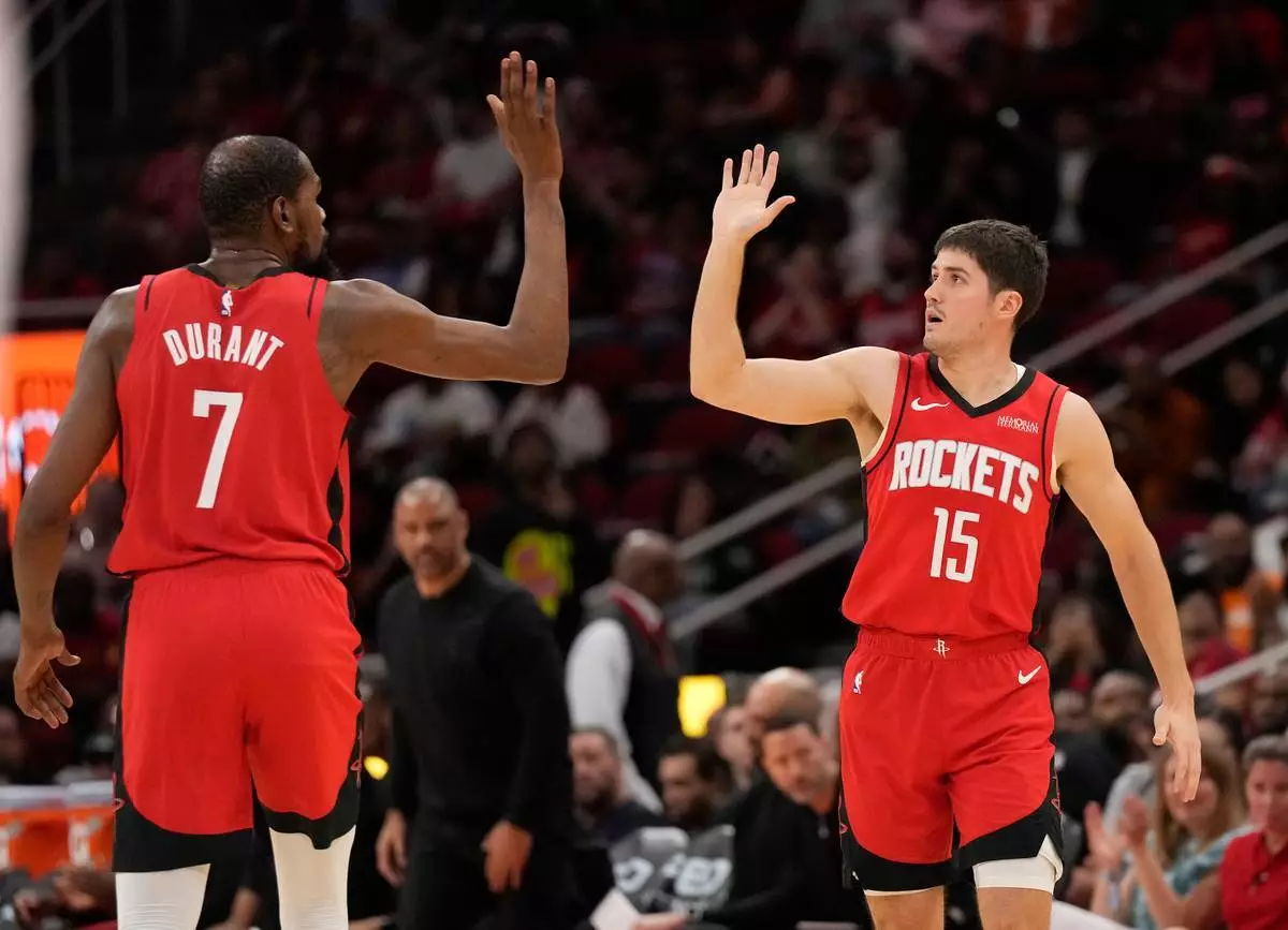 侯斯頓火箭的杜蘭特(7號)在2026年4月3日周五於侯斯頓舉行的一場NBA籃球賽上半場,里德謝潑德(15號)射入三分球後與其擊掌慶祝。(美聯社圖片/Karen Warren) AP圖片