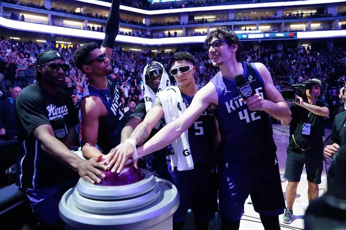 薩克拉門托帝王(Sacramento Kings)球員普雷舍斯阿丘瓦(Precious Achiuwa)(左)、迪倫卡德威爾(Dylan Cardwell)(32號)、戴昆普勞登(Daeqwon Plowden)、尼克克利福德(Nique Clifford)(5號)及馬克森雷諾(Maxime Raynaud)(42號)在帝王隊擊敗新奧爾良塘鵝(New Orleans Pelicans)的NBA籃球賽後,按下按鈕「點亮光束」。攝於2026年4月3日周五,加州薩克拉門托。(美聯社圖片/Alan Greth) AP圖片