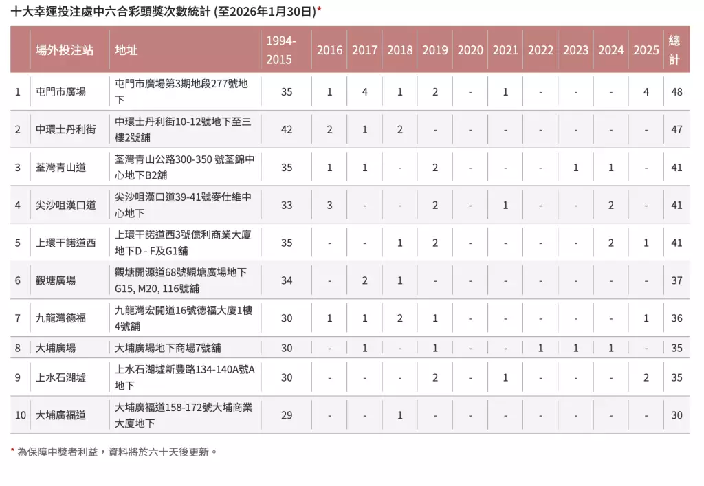 原紀錄保持者中環士丹利街投注處,累計賣出47張頭獎彩票,但根據最新紀錄,自2018年至今的七年間再無售出頭獎彩票,與觀塘廣場及大埔廣福道投注處情況相同。其他投注處方面,上環幹諾道西及九龍灣德福投注處去年各售出一張頭獎彩票;上水石湖墟投注處則在上半年售出兩張。