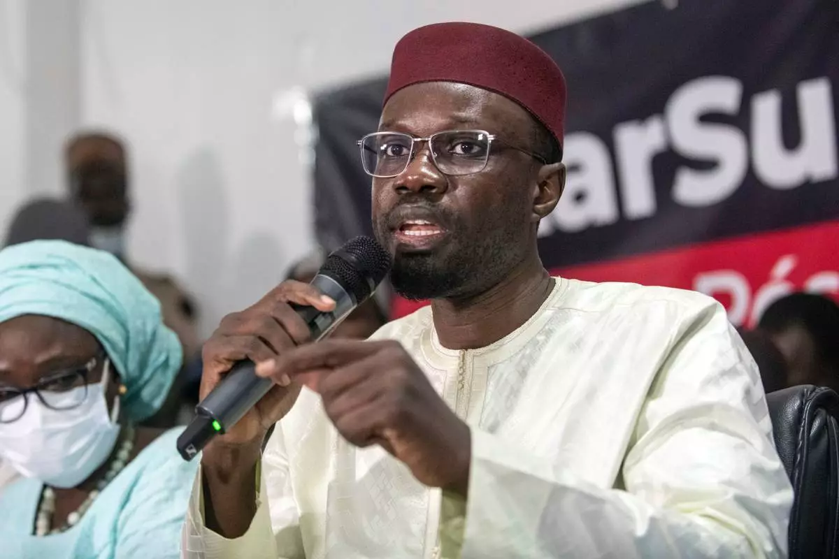 檔案圖片:2021年3月8日,塞內加爾反對派領袖奧斯曼·松科(Ousmane Sonko)在塞內加爾達喀爾獲警方釋放後,向記者發表講話。(美聯社圖片/Sylvain Cherkaoui,檔案圖片) AP圖片