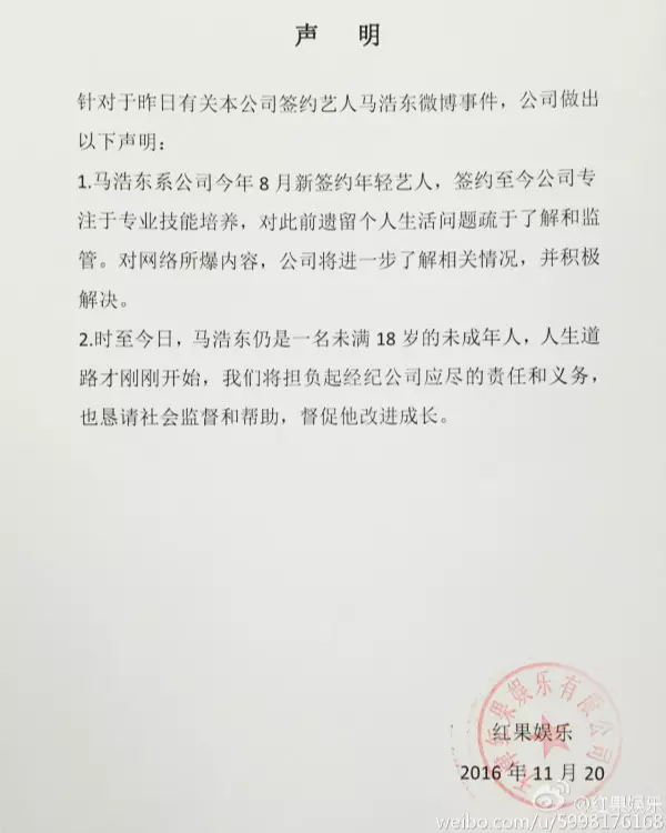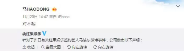 儘管馬浩東的媽媽在微博開腔幫聲,但輿論仍然認定母子二人只是想出名。而事件發生後,馬浩東所在的紅果娛樂亦發表聲明稱:「會了解相關情況,積極解決。」馬浩東則轉發此微博,表示歉意:「對不起。」