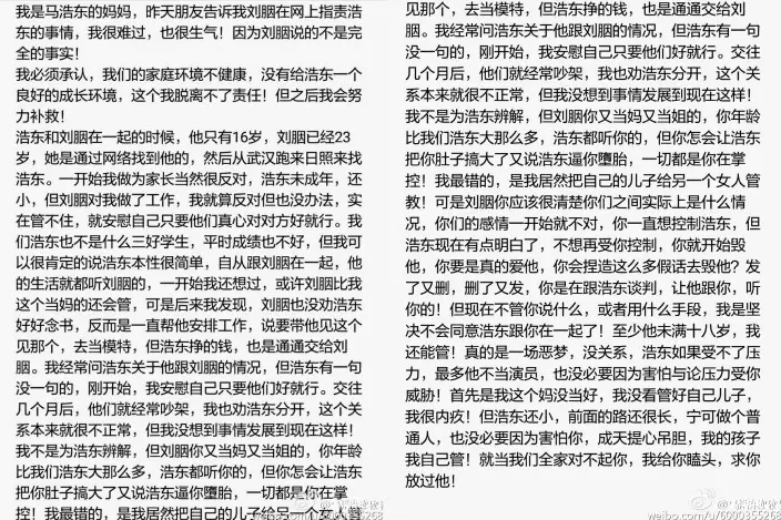 網民在馬浩東的微博下紛紛留言:「人渣」、「你這輩子洗不白了」。出於心疼兒子,馬浩東的媽媽站出來,在微博裡發聲稱「劉女」的控訴並非全部屬實,並不滿說:「浩東都聽你的,但你怎會讓浩東把你肚子搞大了又說浩東逼你墮胎,一切都是你在掌控!」馬母又直指如今兒子想脫離掌控,才會遭「劉女」一連串謊言的詆毀。同時隔空對話「劉女」,「就當我們全家對不起你,我給你磕頭,求你放過他!」而自稱馬浩東前女友的「劉女」則刪除所有微博,只留下一句「清者自清」。