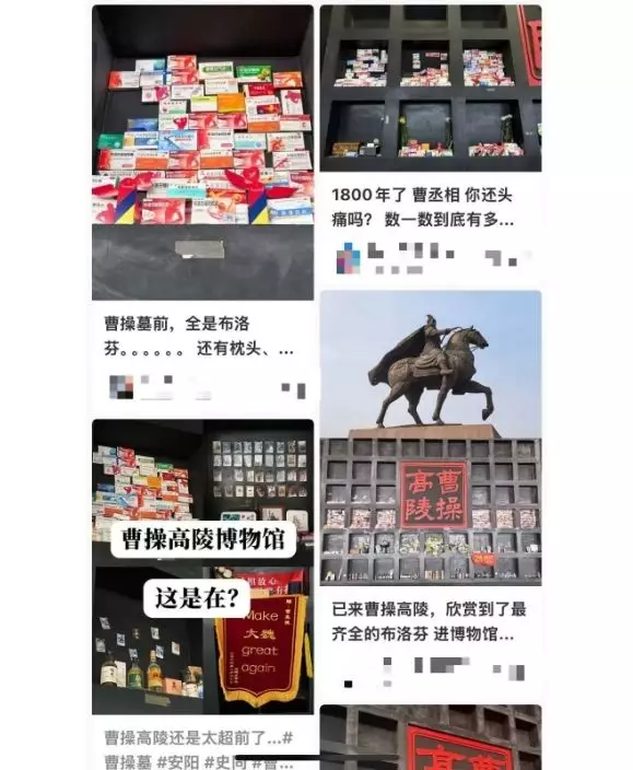 曹操高陵遺址博物館位於河南安陽,向來有不少遊客慕名而來。據內媒「極目新聞」報道,適逢清明時節,曹操位於河南安陽的墓前,擺滿了各式各樣的祭祀用品,如普通的鮮花、香燭等,但當中最讓人注目的,是一盒盒放得整齊的各類口服消炎藥布洛芬,因歷史記載曹操生前患有偏頭痛,後人貼心的希望曹操的老毛病得到紓緩,甚至附有「醫囑」。