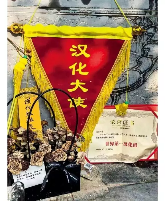 北魏孝文帝拓跋宏墓前掛上了寫著四個大字:「漢化大使 」的錦旗。