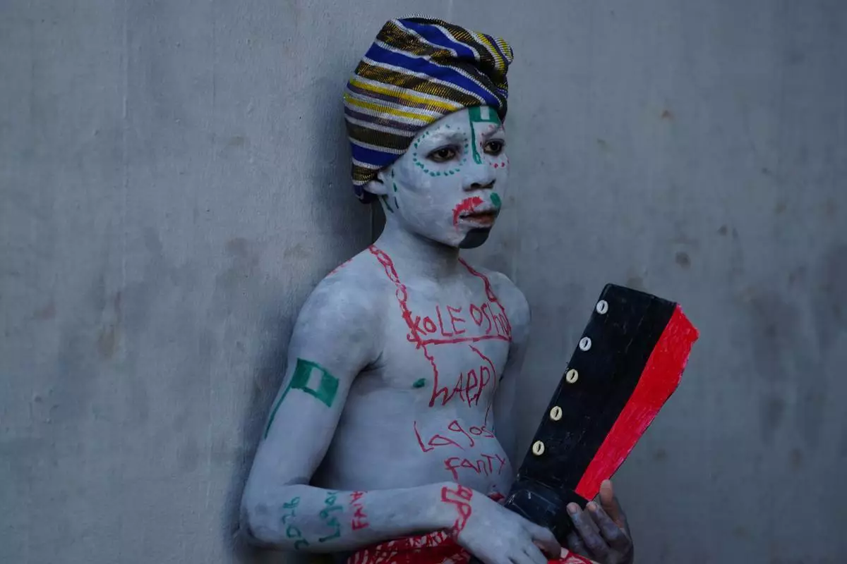 一名全身塗滿顏料的男孩參與尼日利亞拉各斯(Lagos)的芬蒂嘉年華(Fanti Carnival),攝於2026年4月6日周一。(美聯社圖片/Sunday Alamba) AP圖片