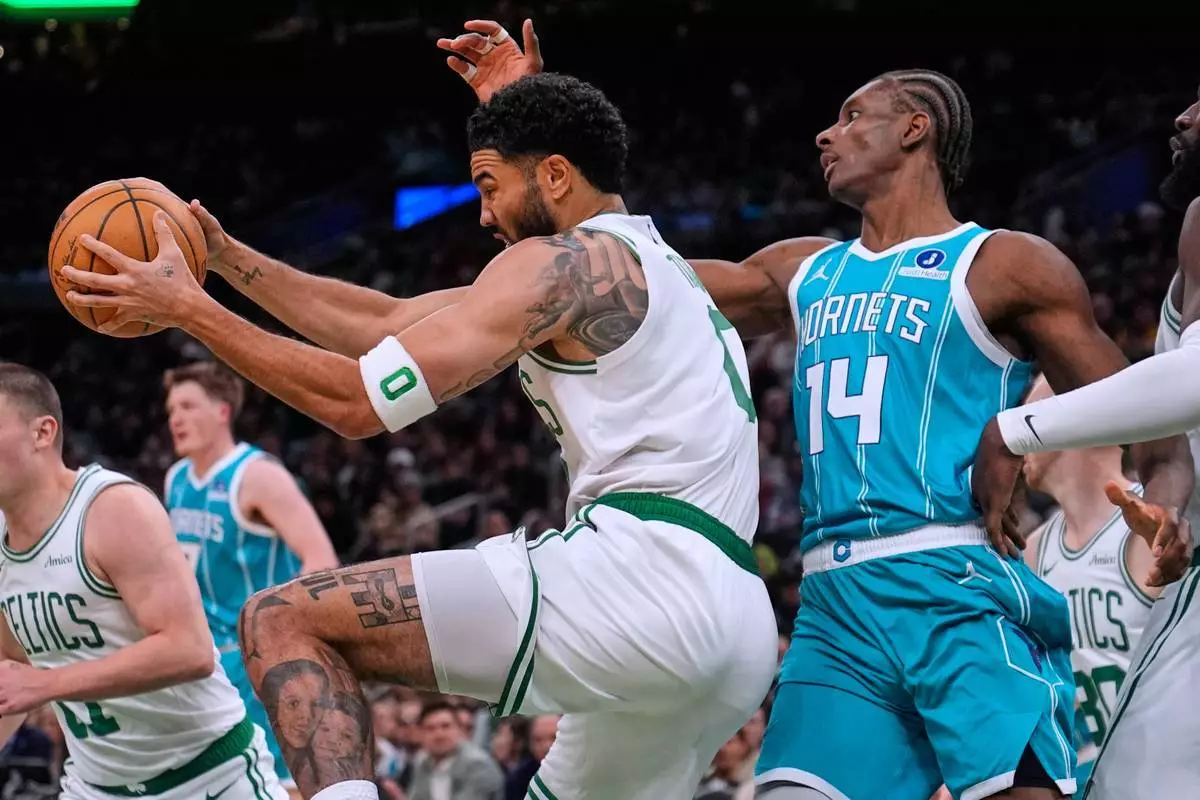 波士頓塞爾特人前鋒謝臣泰譚(Jayson Tatum)(左)在周二(2026年4月7日)波士頓舉行的一場NBA籃球賽上半場,從夏洛特黃蜂前鋒穆沙迪亞巴特(Moussa Diabate)(14號)手中搶得一個籃板。(美聯社圖片/Charles Krupa) AP圖片