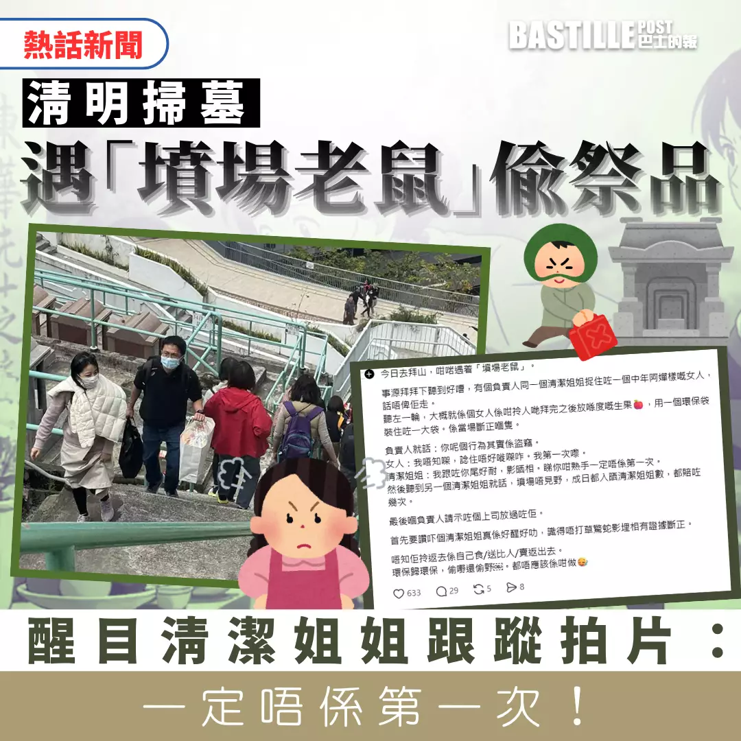清明時節,大批孝子賢孫冒雨前往墳場掃墓。有網民在社交平台分享,日前(4月6日)拜山期間目擊一名中年大嬸,因偷取他人拜祭後留下的生果祭品而被當場揭發。