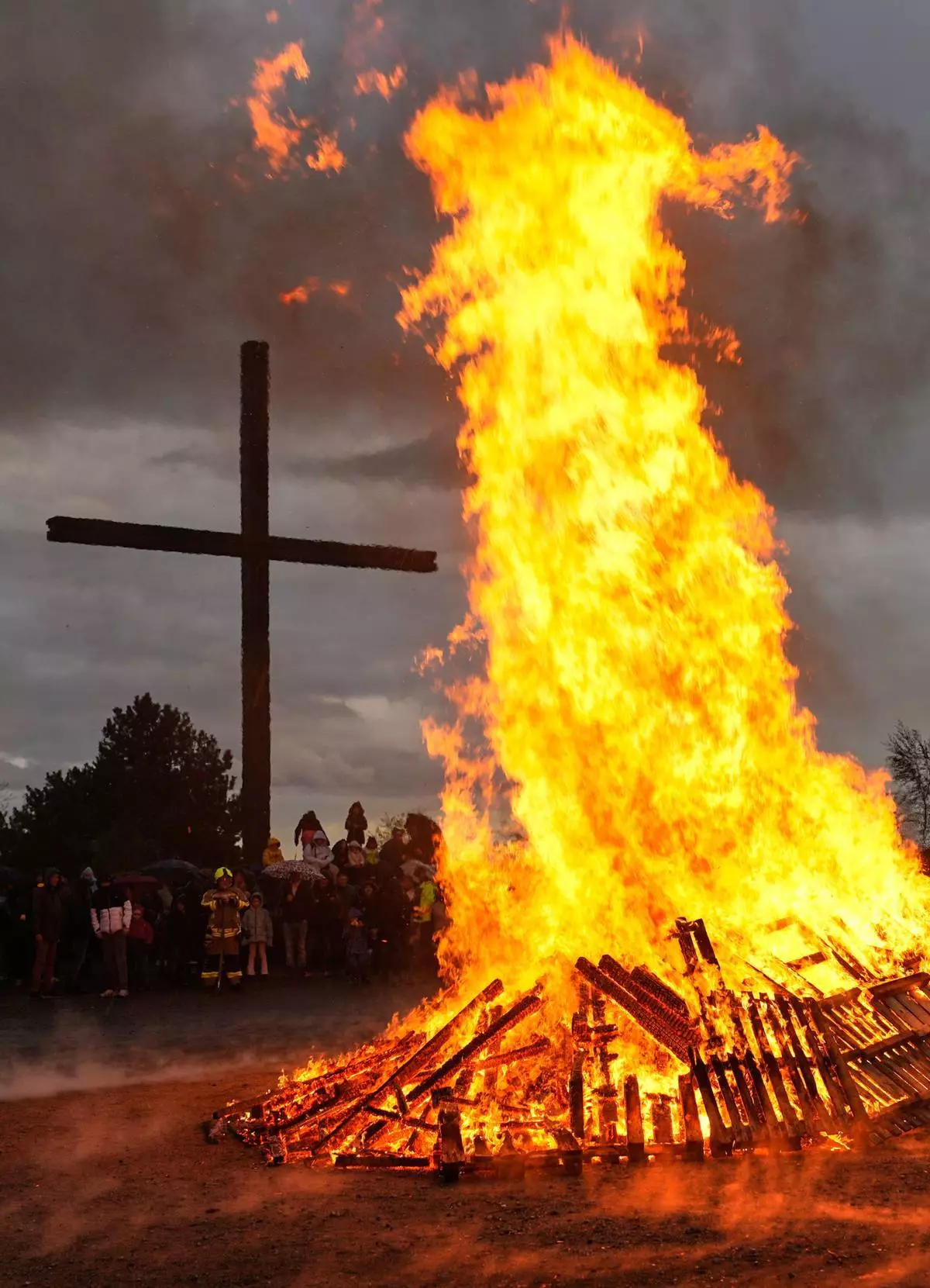檔案圖片:2026年4月5日,德國博特羅普(Bottrop),人們在德國最後一個煤礦的礦渣堆上,參與傳統復活節火堆活動,點燃篝火象徵耶穌基督復活。(美聯社圖片/Martin Meissner, File) AP圖片
