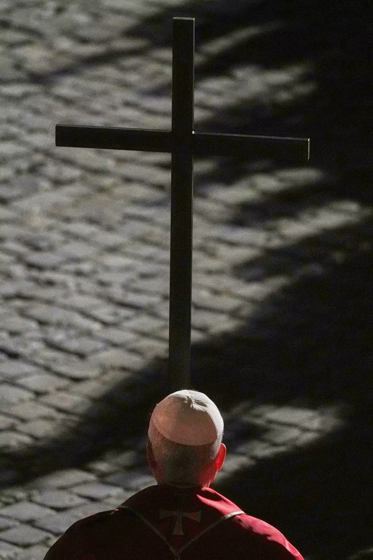 檔案圖片:2026年4月3日,羅馬鬥獸場(Colosseum),教宗利奧十四世(Pope Leo XIV)手持輕巧木製十字架,參與耶穌受難日(Good Friday)火炬苦路遊行,象徵性地重現耶穌基督被釘十字架的歷程。(美聯社圖片/Alessandra Tarantino, File) AP圖片