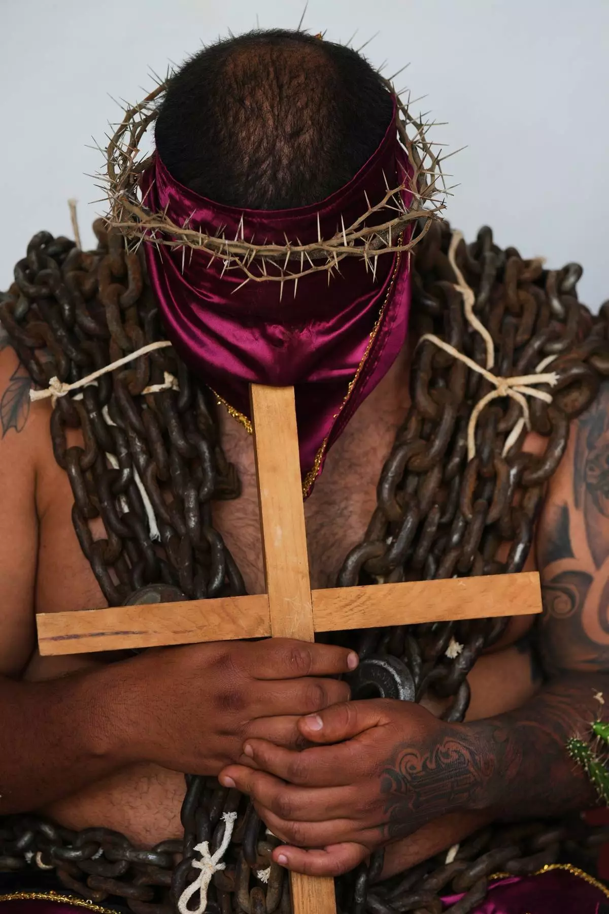 檔案圖片:2026年4月3日,墨西哥阿特利斯科(Atlixco),一名蒙眼懺悔者被鐐銬束縛,手臂被仙人掌刺穿,手持十字架,等候耶穌受難日(Good Friday)遊行開始。(美聯社圖片/Fernando Llano, File) AP圖片