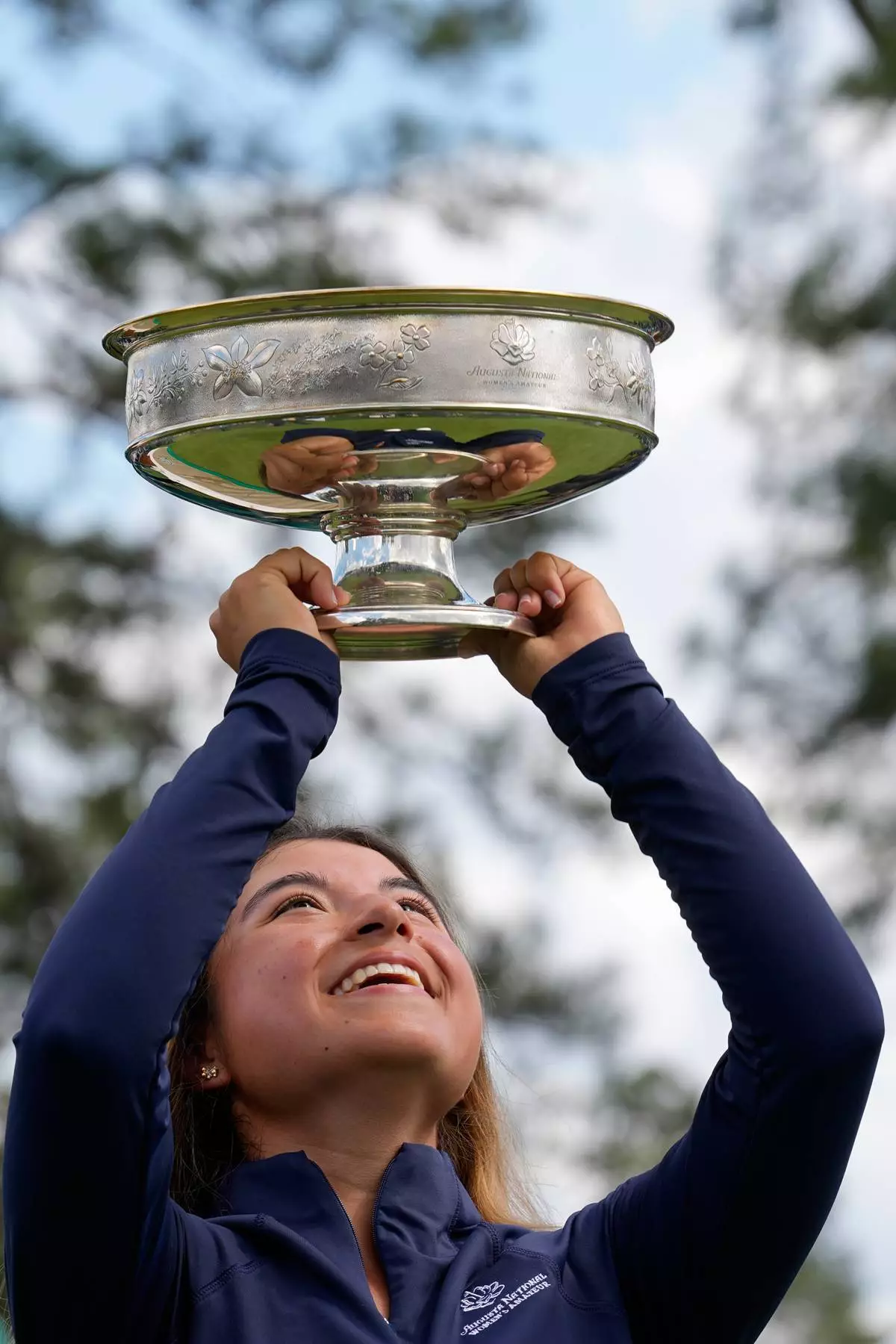 檔案圖片:2026年4月4日,哥倫比亞選手Maria José Marin在喬治亞州奧古斯塔(Augusta)贏得奧古斯塔國家女子業餘高爾夫錦標賽(Augusta National Women's Amateur)後,舉起獎盃。(美聯社圖片/David J. Phillip, File) AP圖片