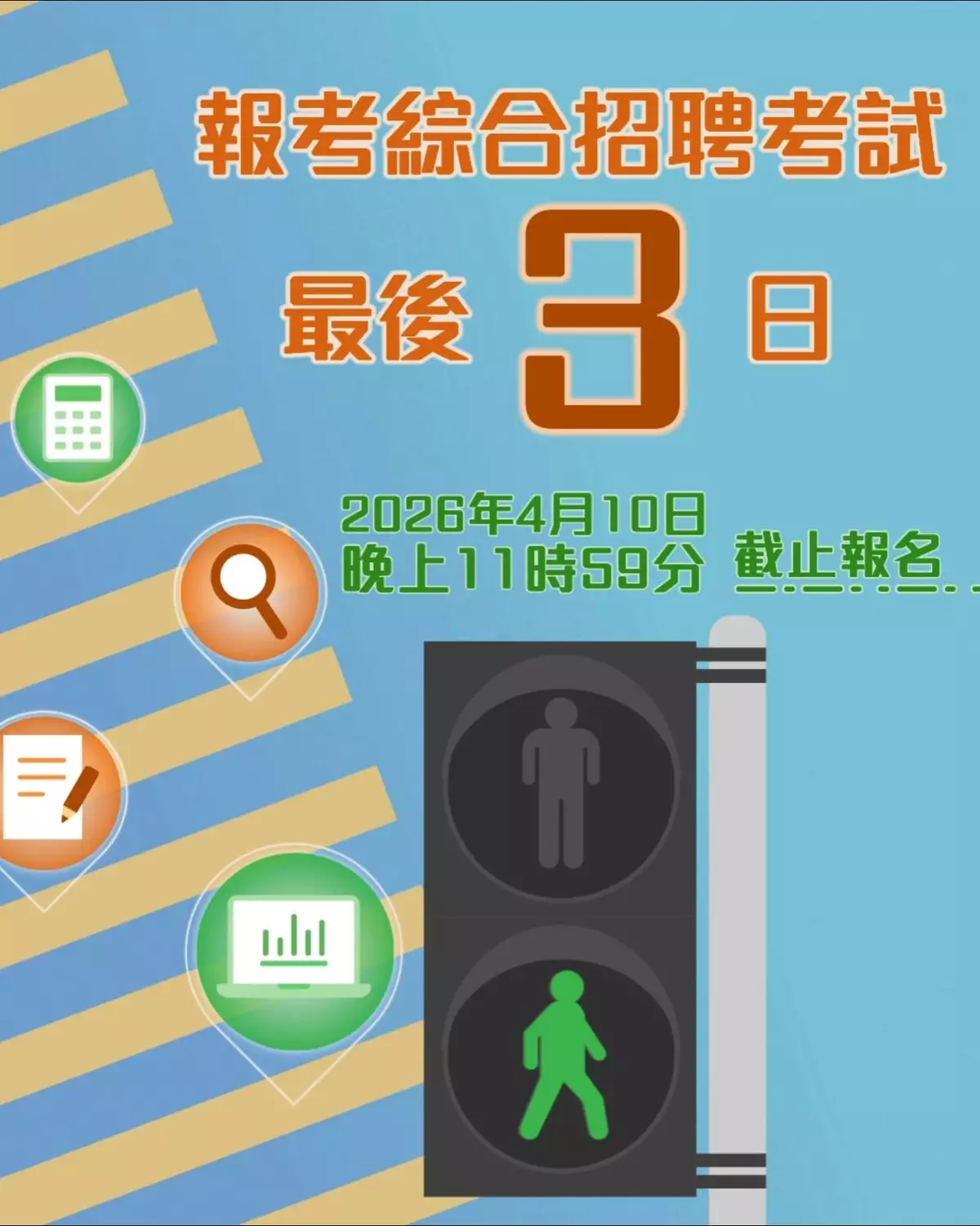 公務員事務局提醒有意投考政府職位的人士,將於 6 月 6 日舉行的綜合招聘考試(CRE)將於 4 月 10 日截止報名,呼籲申請者把握機會,為投身政府踏出第一步。