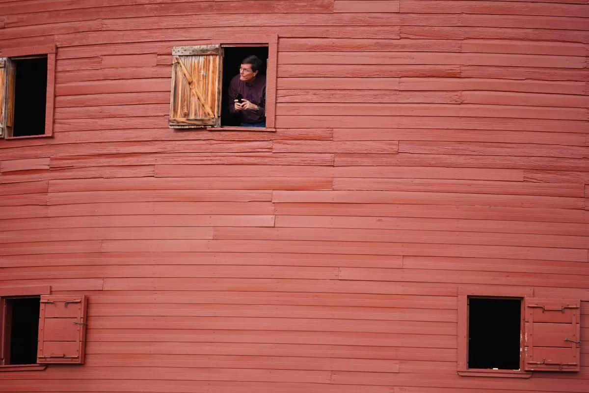 他耐心地等待,最終拍到另一位在窗邊的人,隨後進入穀倉,訪問了來自愛荷華州(Iowa)、正與妻子羅賓(Robbin Dobbins)一同旅行的大衛多賓斯(David Dobbins)。這對夫婦在穀倉內遇見了雪莉格雷厄姆(Shelley Graham)和占羅斯(Jim Ross),他們正是66號公路百周年紀念書籍的作者。羅賓多賓斯最近獲贈這本書,因此能與作者見面對她而言是個特別的驚喜。這種意想不到的巧合,為照片增添了趣味和特殊意義。