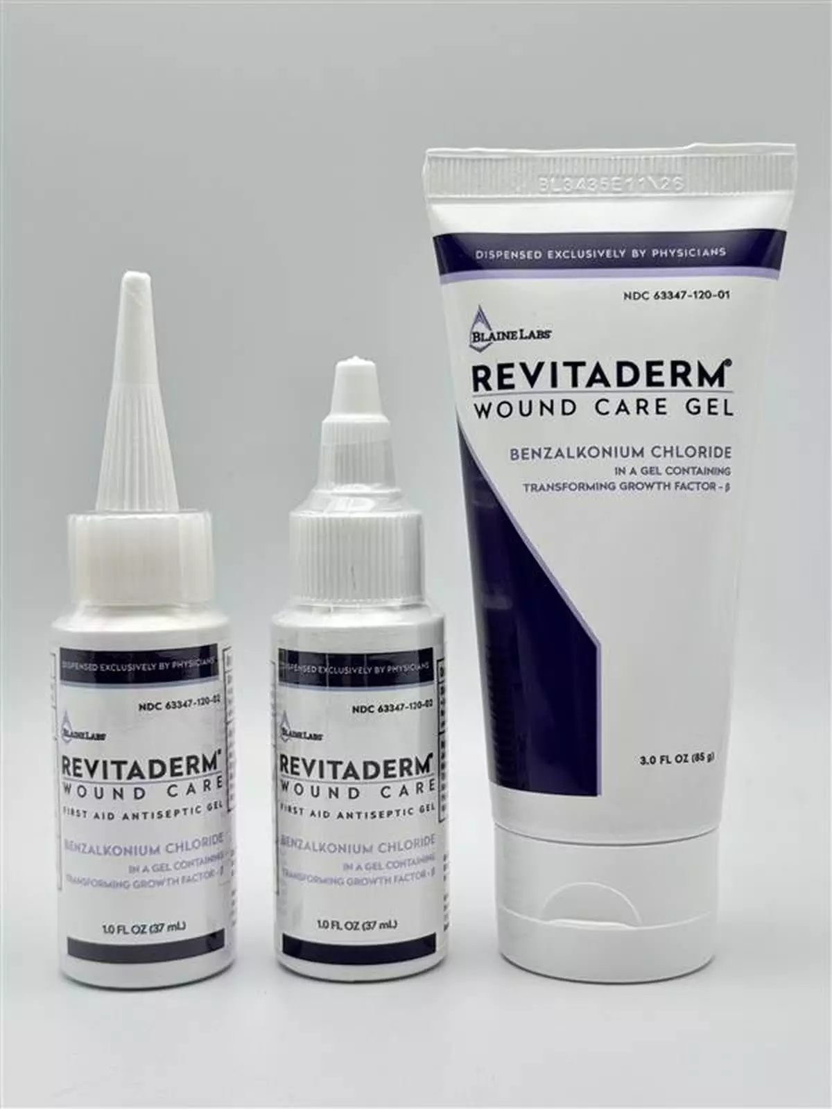 該產品用作局部消毒劑,用於急救,以幫助預防輕微割傷、擦傷和燒傷的感染風險。產品以1安士瓶裝和3安士管裝出售。Revitaderm® 傷口護理凝膠可透過其紫色邊飾識別,而Tridergel™ 傷口護理則可透過其淺藍色邊飾識別。1安士瓶裝有兩種瓶蓋配置:旋轉蓋和較長的尖頭蓋,並以收縮帶/瓶身帶密封。瓶底印有有效日期和批號。3安士管裝的批號和有效日期則印在管頂的壓邊處。Revitaderm® 傷口護理消毒凝膠(1安士及3安士)和Tridergel™ 傷口護理(1安士)已在美國全國範圍內分銷給醫療服務提供者(診所),並未分銷作零售或網上銷售。