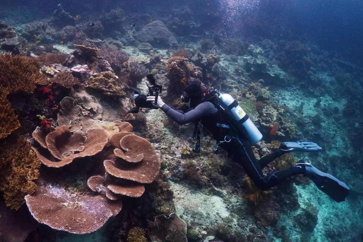 2026年3月5日周四,印尼四王群島克爾諾海峽(Kerno Channel)潛水點,海洋生物學家波爾·拉莫斯(Pol Ramos)正在拍攝珊瑚。(美聯社圖片/Claudia Rosel) AP圖片