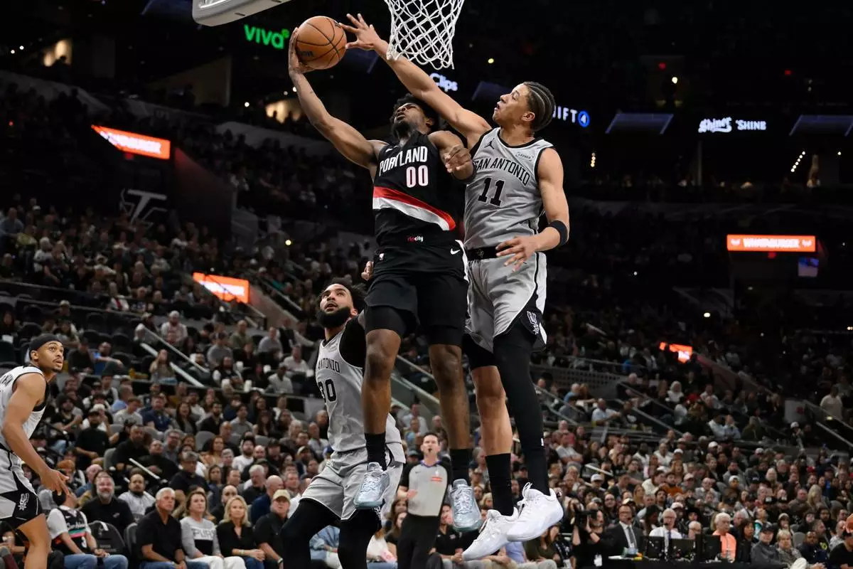 2026年4月8日周三,波特蘭拓荒者後衛史葛·軒達臣(Scoot Henderson)(00號)在對陣聖安東尼奧馬刺的NBA籃球賽上半場,遭馬刺前鋒卡特·拜仁(Carter Bryant)犯規。(美聯社圖片/Darren Abate) AP圖片
