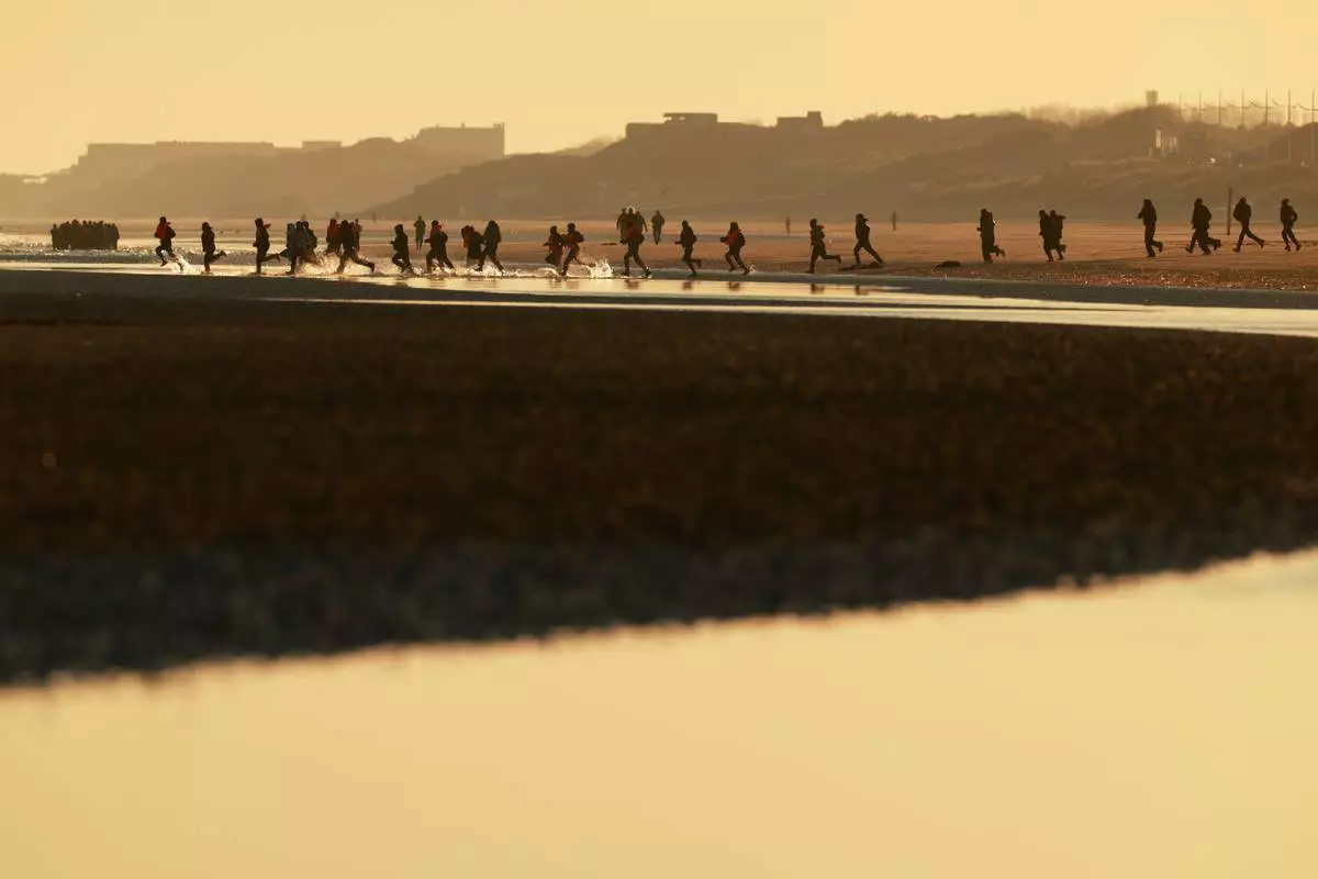 2026年4月8日周三,在法國北部馬洛萊班(Malo-les-Bains),有移民跑向一艘小船,試圖前往英國。(美聯社圖片/Jean-Francois Badias) AP圖片