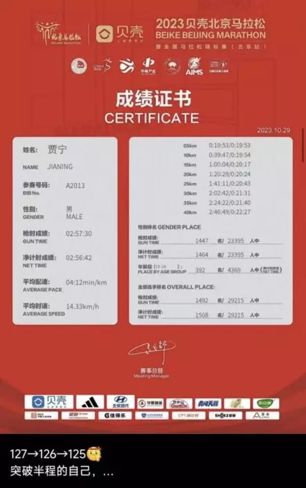 賈寧表示,他自2017年開始跑步,至今已參加逾30場全程馬拉松賽事。2024及2025年間,他曾從北京出發,跑步抵達上海、石家莊、鄭州、衡水等城市。根據賈寧提供的軟件數據顯示,他完賽總里程超過947公里。在2023年貝殼北京馬拉松中,他成功「破三」,以2小時56分42秒完賽。