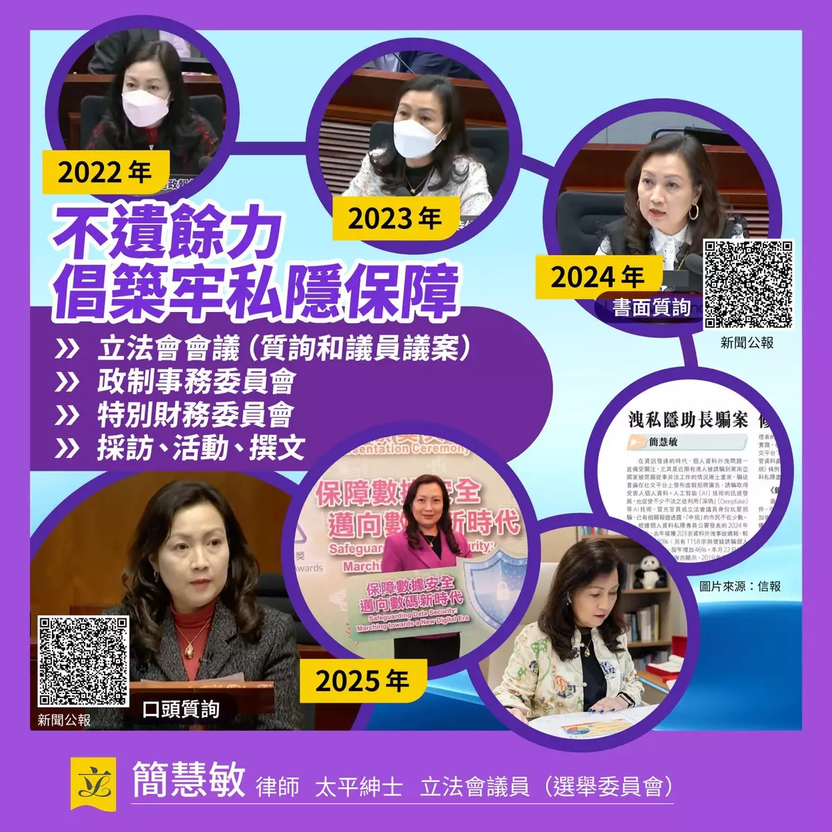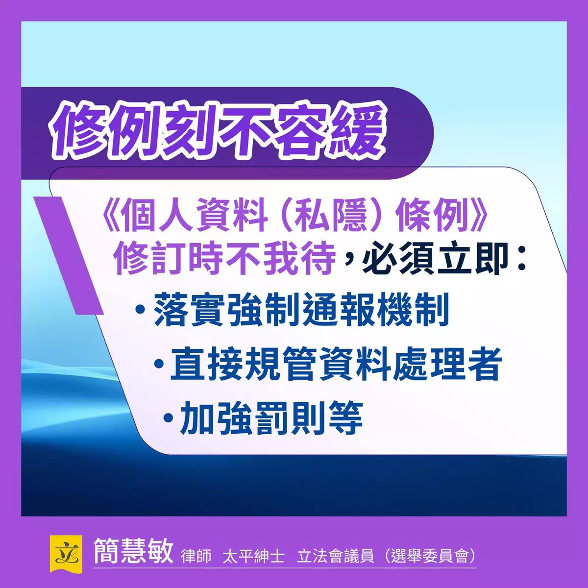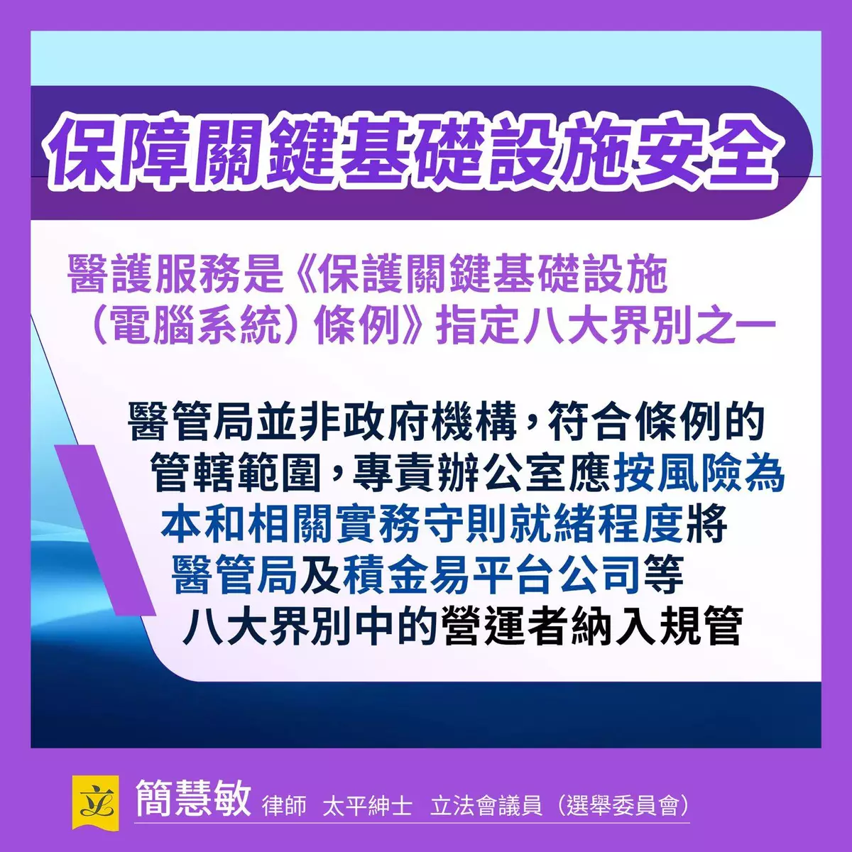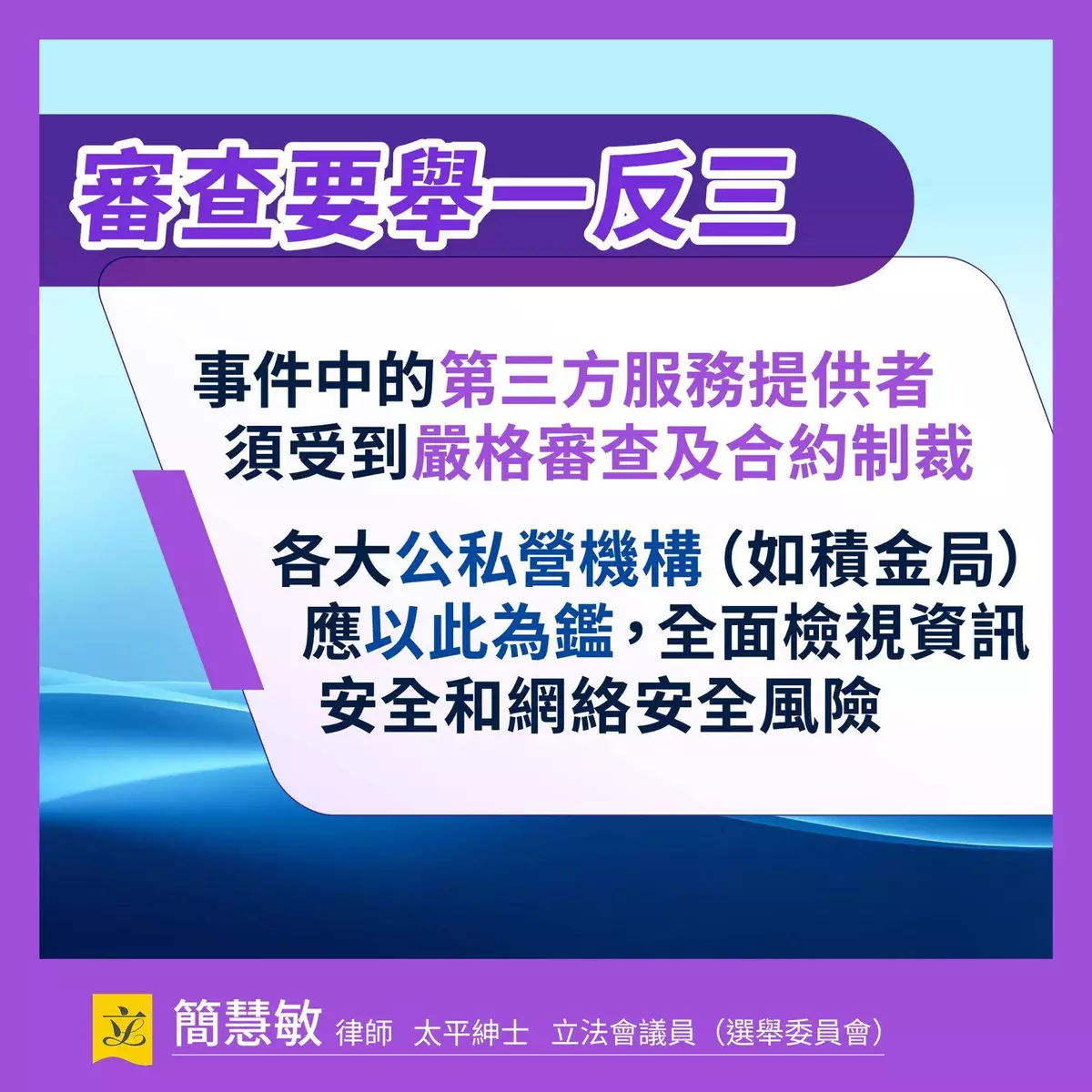 簡慧敏表示,早在2022年她就促請修訂《個人資料(私隱)條例》,落實強制通報機制、直接對第三方資料處理者規管及加強罰則等。 其後,在不同場合包括立法會大會、政制事務委員會、特別財務委員會,以及採訪及活動等都不遺餘力,倡築牢私隱保障。在2025年初,簡慧敏擔任《保護關鍵基礎設施(電腦系統)條例草案》法案委員會主席,在審議中多次強調,政府當局應按風險為本的原則和相關實務守則就緒程度將醫院管理局 和積金易平台公司 等八大類別中的營運者納入規管。簡慧敏認為,今次事件無疑又是一次教訓,持續完善資訊安全和網絡安全的監管制度刻不容緩。