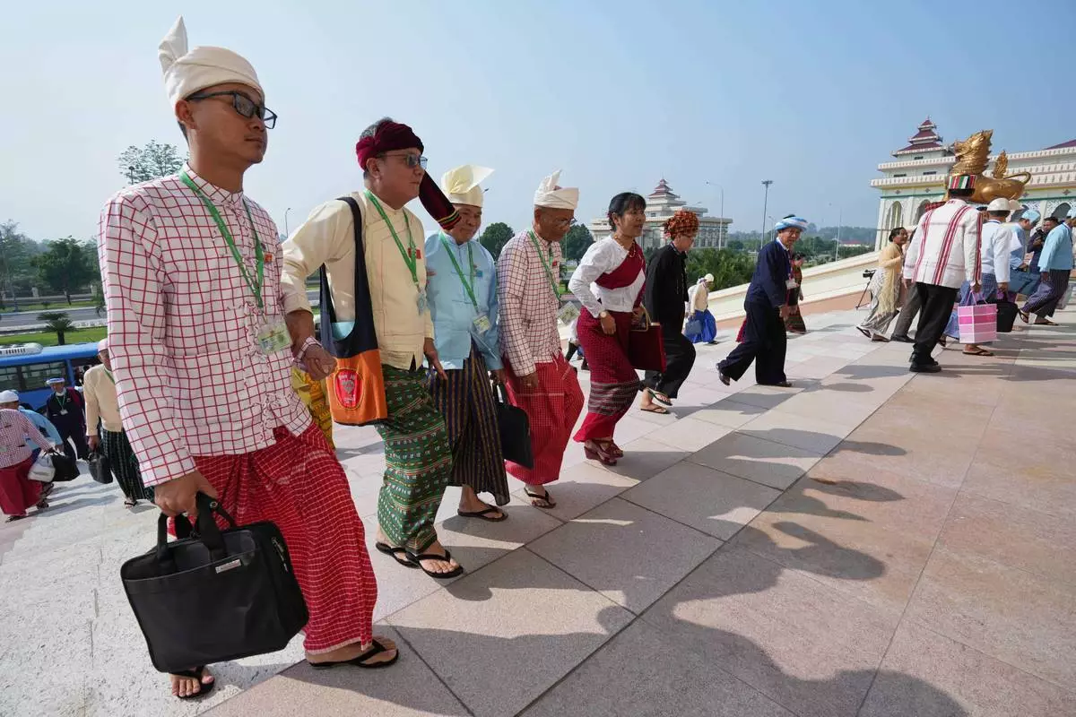 民族議員周四(2026年4月9日)抵達緬甸內比都的聯邦國會大樓,準備出席會議。(美聯社圖片/Aung Shine Oo) AP圖片