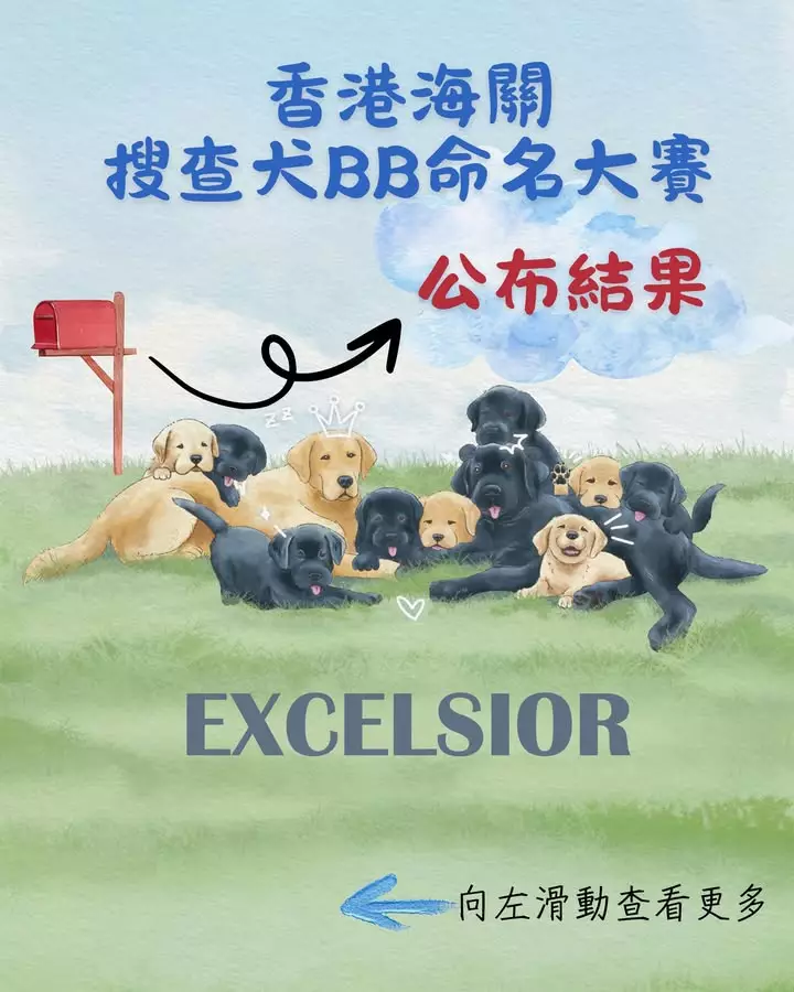 香港海關早前舉辦的搜查犬BB命名大賽結果9日公佈。是次比賽以「EXCELSIOR(精益求精)」一詞的字母為每隻幼犬取名,寄望牠們在訓練及工作上精益求精,成為海關得力助手。